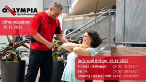Öffnungszeiten zum Feiertag am 19.11.2025 Wir wünschen Dir einen erholsamen Feiertag und freuen uns, wenn Du bei uns vorbeischaust. Dein OLYMPIA-Team