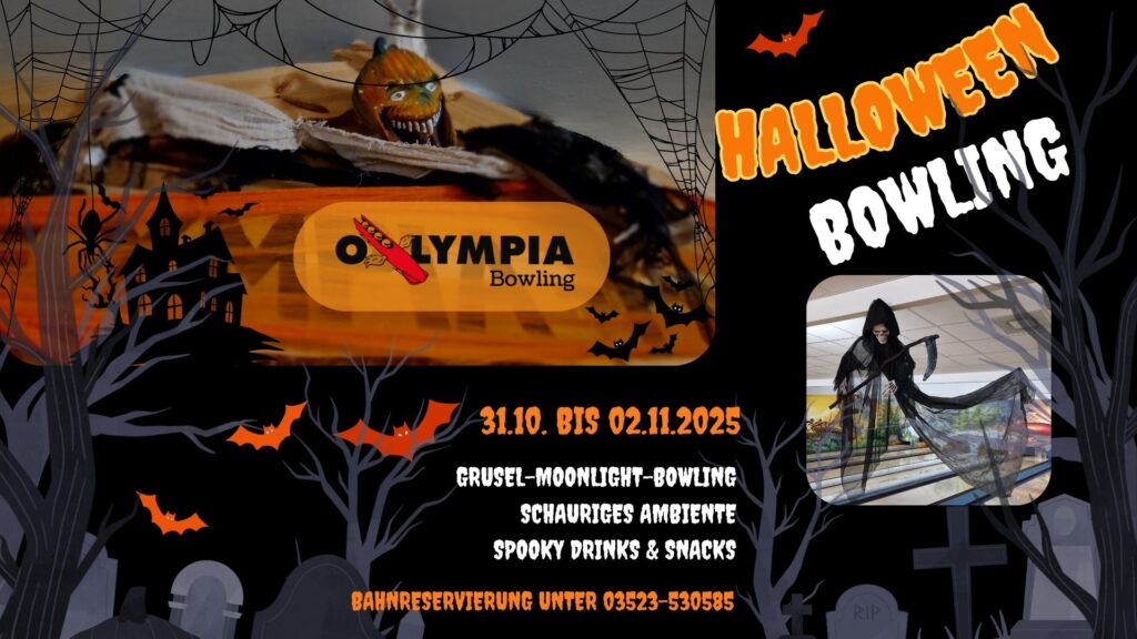 Vom 31.10. bis 02.11.2025 gruselt es bei uns auf der Bowlingbahn. Im schaurigen Ambiente kannst Du Bowling spielen und spooky Drinks & Snacks genießen.